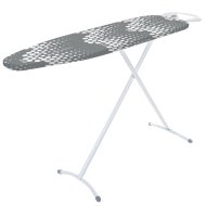 A sturdy ironing board has an oval V rest which prevents stream build up and safe uron 'set down' with ironing