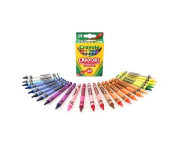 Crayola Wax Crayons come in 24 bright colours, including: indigo, blue, cerulean, blue-green, green, yellow-green, green-yellow, dandelion, yellow, yellow-orange, apricot, orange, scarlet, red-orange, red, violet-red, red-violet, carnation pink, violet, blue-violet, brown, white, grey and black.