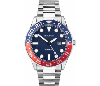 QUALITY MATERIALS - This watch is fastened with a stainless-steel bracelet. The watch has a silver-plated alloy case with a red and blue rotating bezel housing a dark blue dial. Features include a date window, luminous hands and hour markers and up to 50 metres water resistance. The bracelet has a maximum length of 150mm and minimum length of 208mm and has removable links.