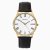 Featuring a round gold plated case enclosing a white dial with Roman numerals and a date display, the watch is fastened with a brown leather strap that sits comfortably on the wrist.